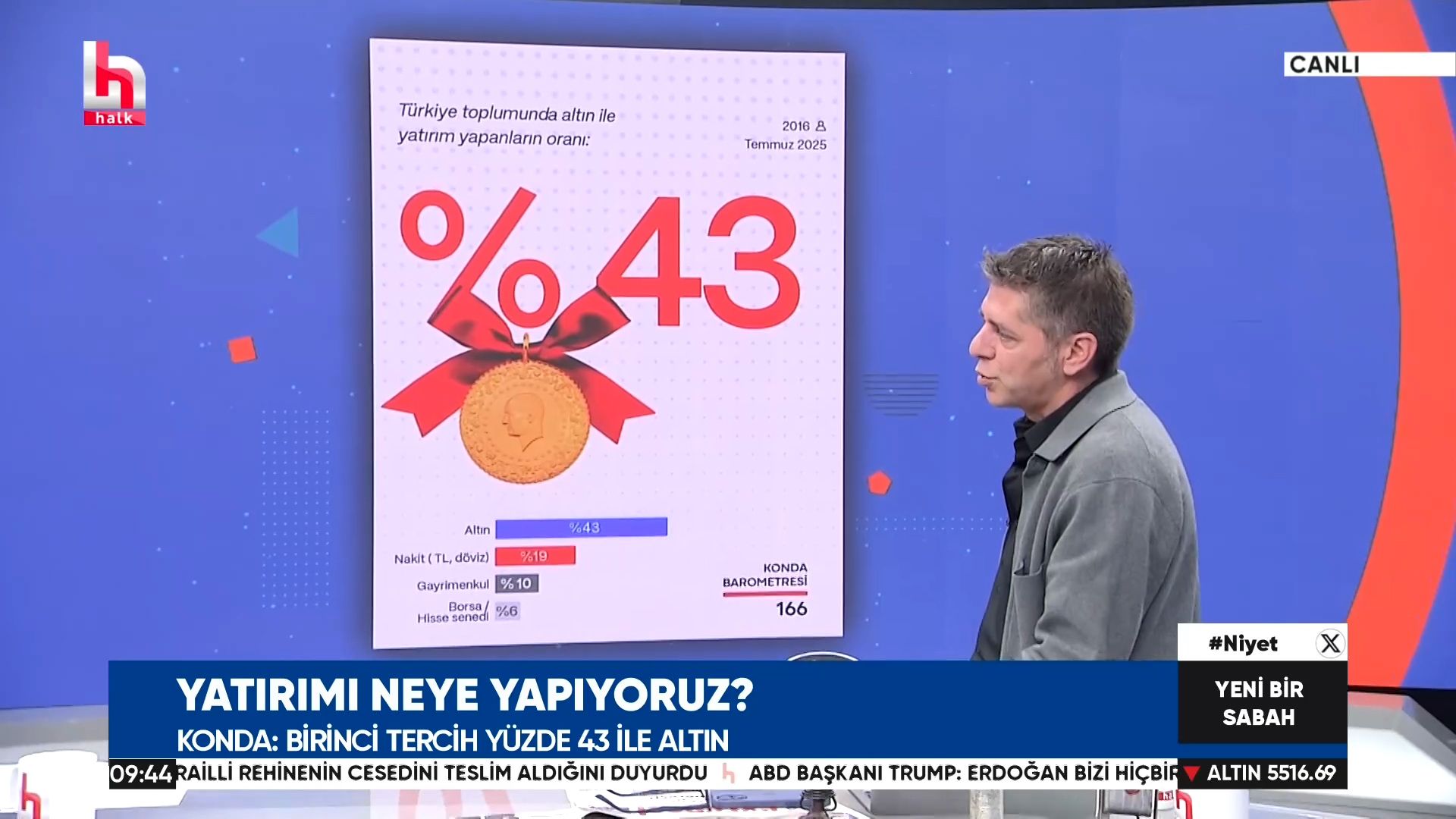 KONDA’nın yatırım alışkanlıklarına ilişkin Temmuz 2025 tarihli çalışmasına göre, halkın en çok tercih ettiği yatırım aracı yüzde 43 ile altın. Onu yüzde 19 ile nakit (TL ve döviz), yüzde 10 ile gayrimenkul, yüzde 6 ile borsa/hisse senedi takip ediyor.