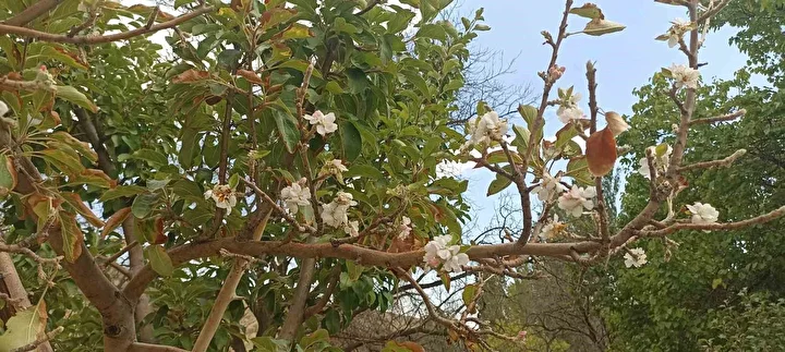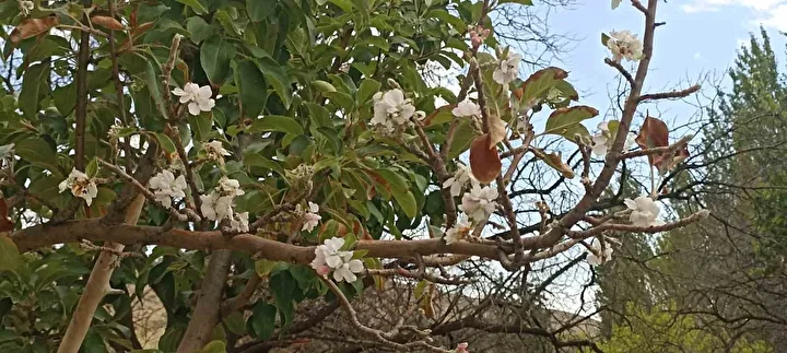 Bu elma bizim bölgemize özgü ’hünkâr elması’ isimli bir elma çeşidi. Ağacın bir kısmı yeşil olmasına rağmen diğer tarafı çiçek açmış. Ocak veya şubat ayında da bu ağaçtan elma yeriz diye tahmin ediyorum…